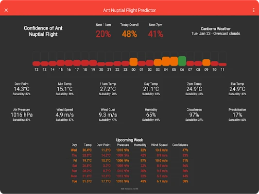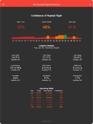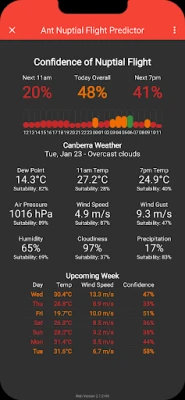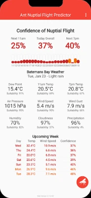 Ant Nuptial Flight Predictor downloads the weather in your current location and gives you the rough likelihood that queen ants are flying near you today and for the next week. When the percentage is high, time to get outside and looking for ants in your local area!