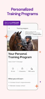 The training programs break down goals into specific steps ranging from 5 to 11 individual sessions and include homework for your equestrian practice.